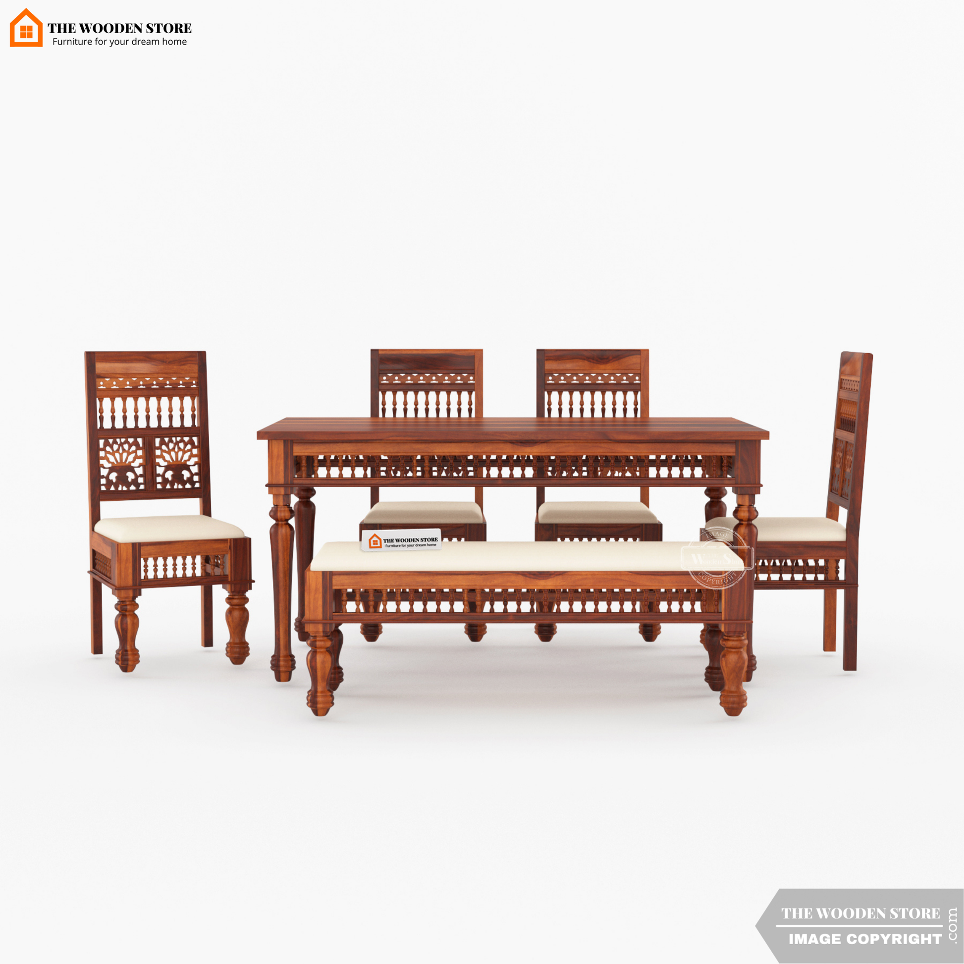 Ekatra 6 Seater Dining Set with Bench in Honey Finish is a premium solid wood dining ensemble crafted from high-quality Sheesham wood, designed to create a warm, inviting focal point for contemporary dining spaces. The honey finish lends a soft, natural glow to the wood, allowing the grain to add depth while keeping the setting bright and elegant. This 6 seater dining set features a generously sized table of 59 L x 36 W x 30 H (Inch), complemented by a sturdy bench measuring 48 L x 18 W x 19 H (Inch) and ergonomically proportioned chairs sized 16 L x 17.5 W x 38 H (Inch), offering flexible seating for everyday meals and social gatherings. The bench introduces a relaxed, modern touch while optimising space and movement around the table. Built for lasting strength and refined comfort, this dining set is delivered with expert assembly and backed by a 36-month warranty, making it a sophisticated and practical centrepiece for Indian dining rooms.
