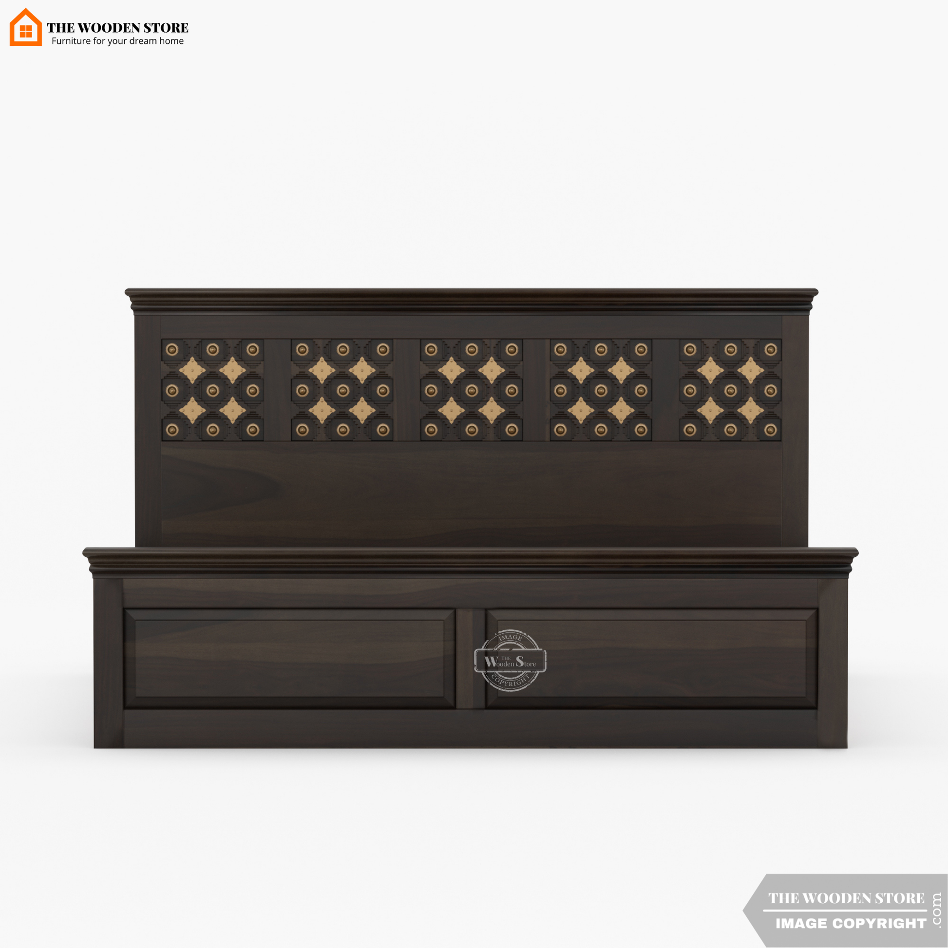 Indi Brass Bed with Drawer Storage in Walnut Finish is a queen size solid Sheesham wood bed with built-in drawer storage, crafted for those who want smart organisation and understated style in one piece. Finished in a deep walnut tone that brings out the wood’s natural grain, this queen wooden bed with drawers is designed to support a standard 78 × 60 Inches mattress (mattress not included) and features smooth-glide drawers beneath the frame to neatly organise blankets, bedsheets, and daily essentials. The balanced proportions and clean lines lend a calm, refined presence to your bedroom, while the solid wood construction ensures long-lasting durability. With expert assembly support and a 36-month warranty, this bed promises reliable performance and peace of mind. Perfect for master bedrooms or guest rooms, it enhances your sleep space with practical storage and timeless design that fits seamlessly into Indian homes.
